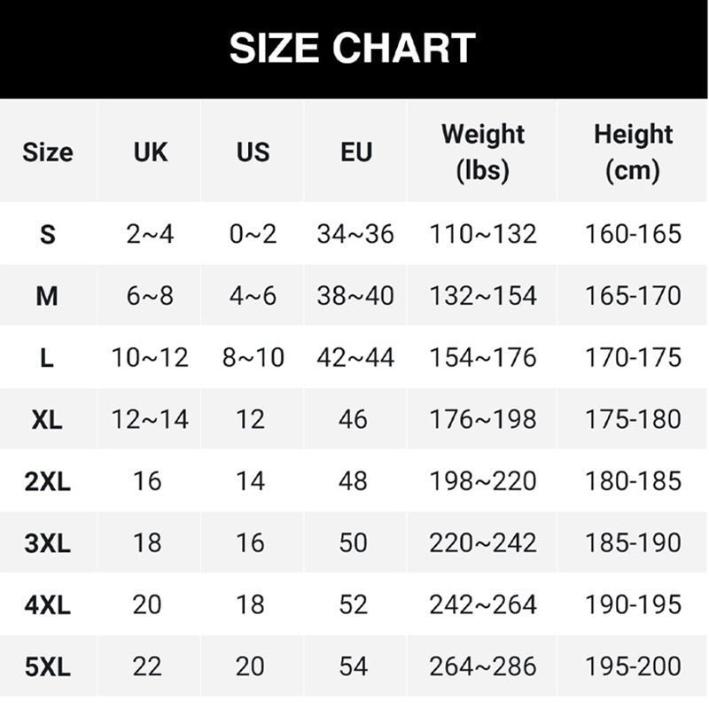 Tailles : S, M, L, XL, 2XL, 3XL, 4XL, 5XL
